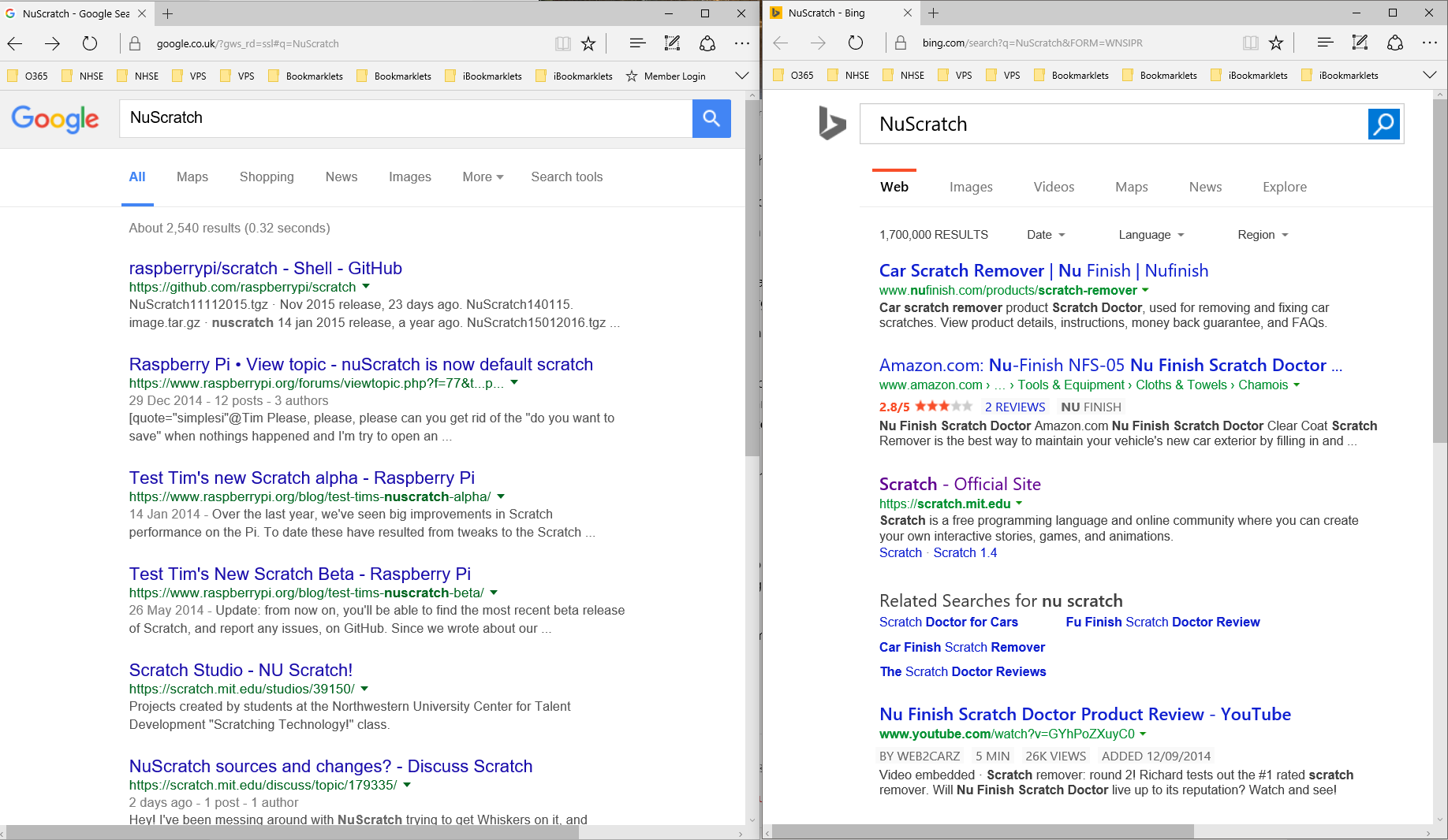 But I’m sorry Microsoft, it doesn’t work! Even when not logged in to Google, it consistently returns far more relevant answers as evidenced by the following search for the latest Raspberry Pi flavoured version of the Scratch programming environment “NuScratch”